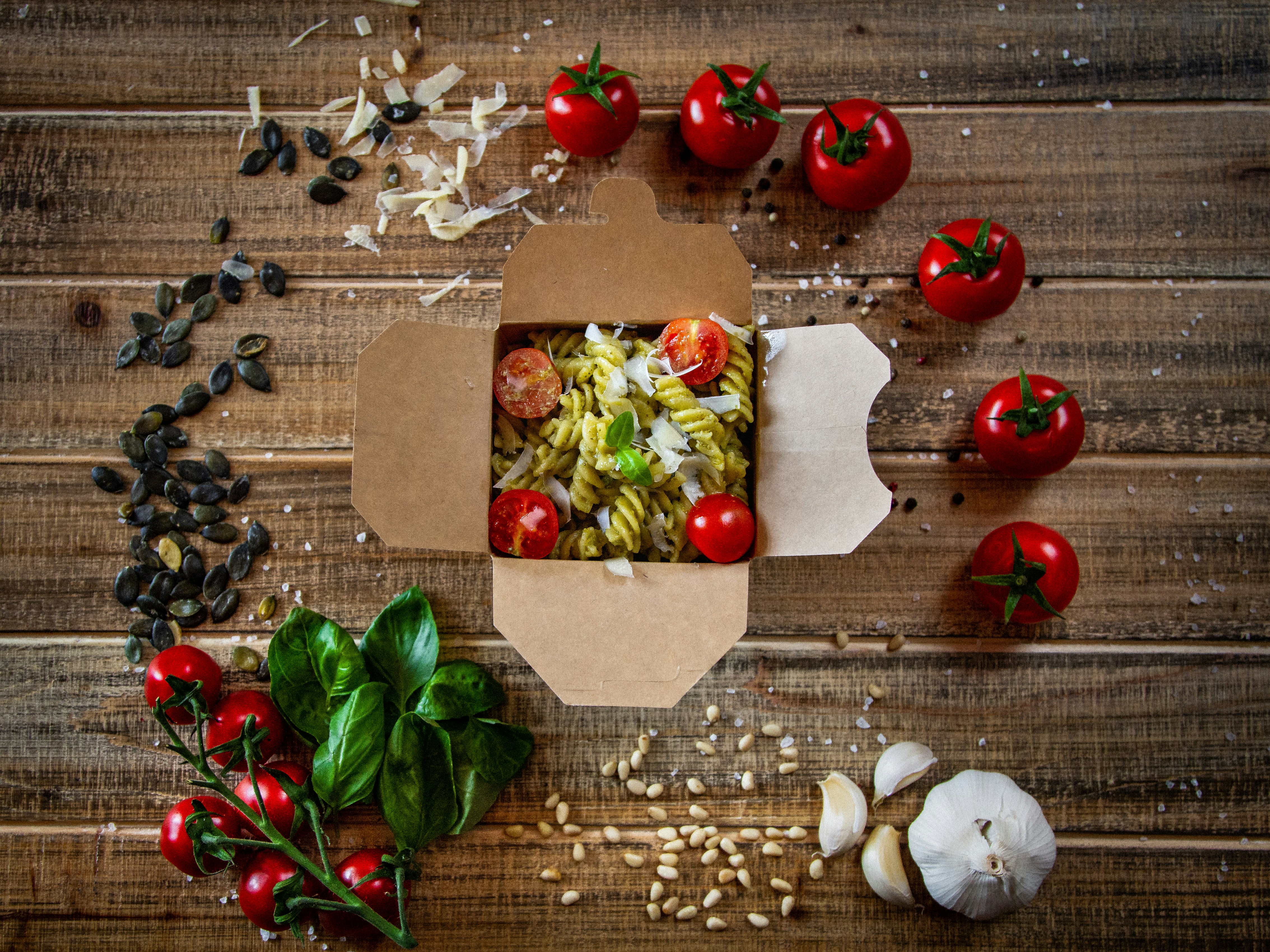 Rustic Italian pasta dish with fresh tomatoes and basil on wooden table