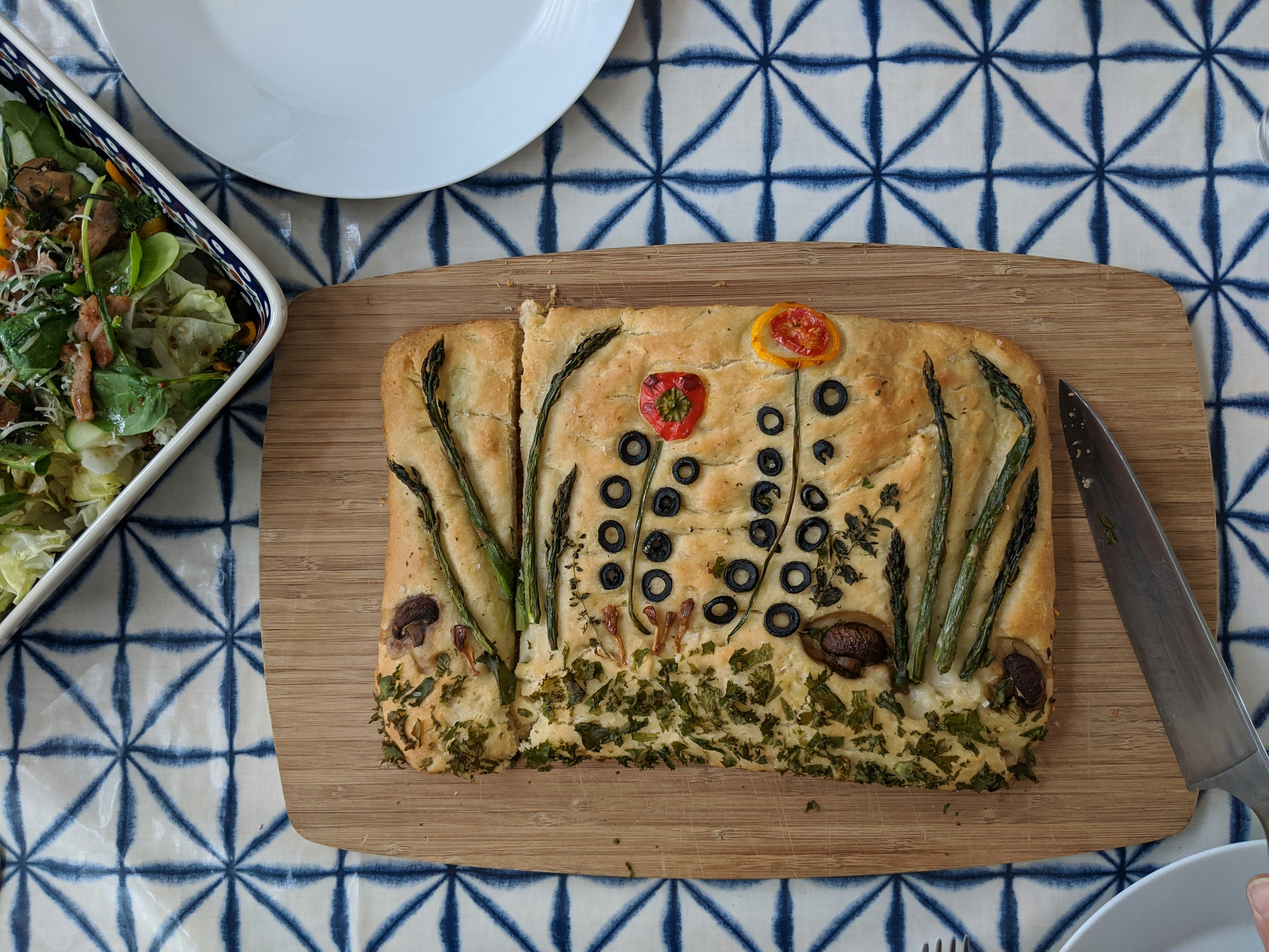 Focaccia soffice con pomodorini, olive e origano, cotta nel forno a legna
