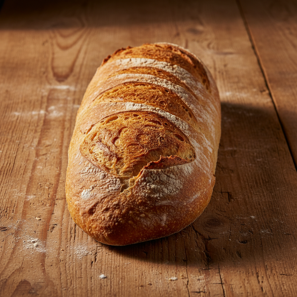 Freshly baked Italian bread with golden crust on rustic wooden board