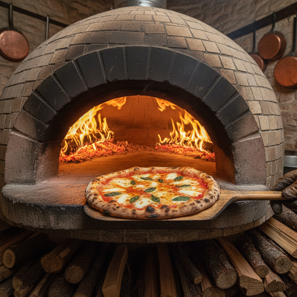 Traditional wood-fired pizza with fresh mozzarella and basil leaves