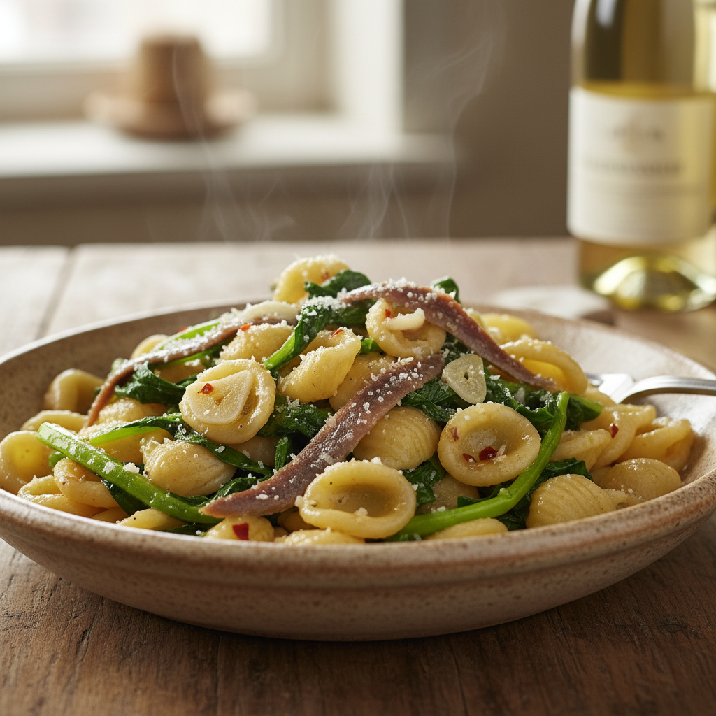 Pasta tradizionale pugliese con cime di rapa, aglio, acciughe e peperoncino
